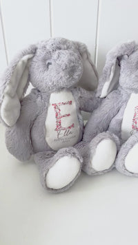 Our bunnies are suitable from birth with sewn eyes and mouth, ensuring safety for all ages. A truly beautiful Easter gift which doubles as a cuddly friend. At a size of 35cm, this customised plush soft toy is just the right size for a little one to cuddle with and is safe for all ages.